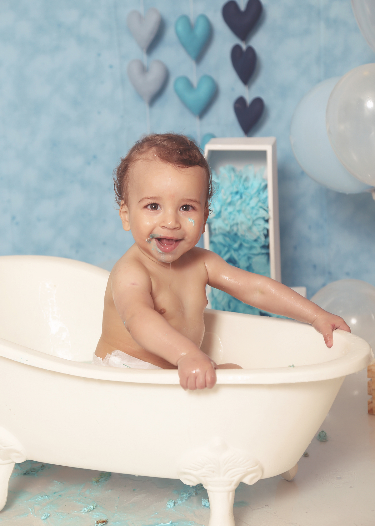 Nesse ensaio o que realmente importa é deixar a criança se divertir, o Arthur adorou o bolo e fez muita festa na banheira!