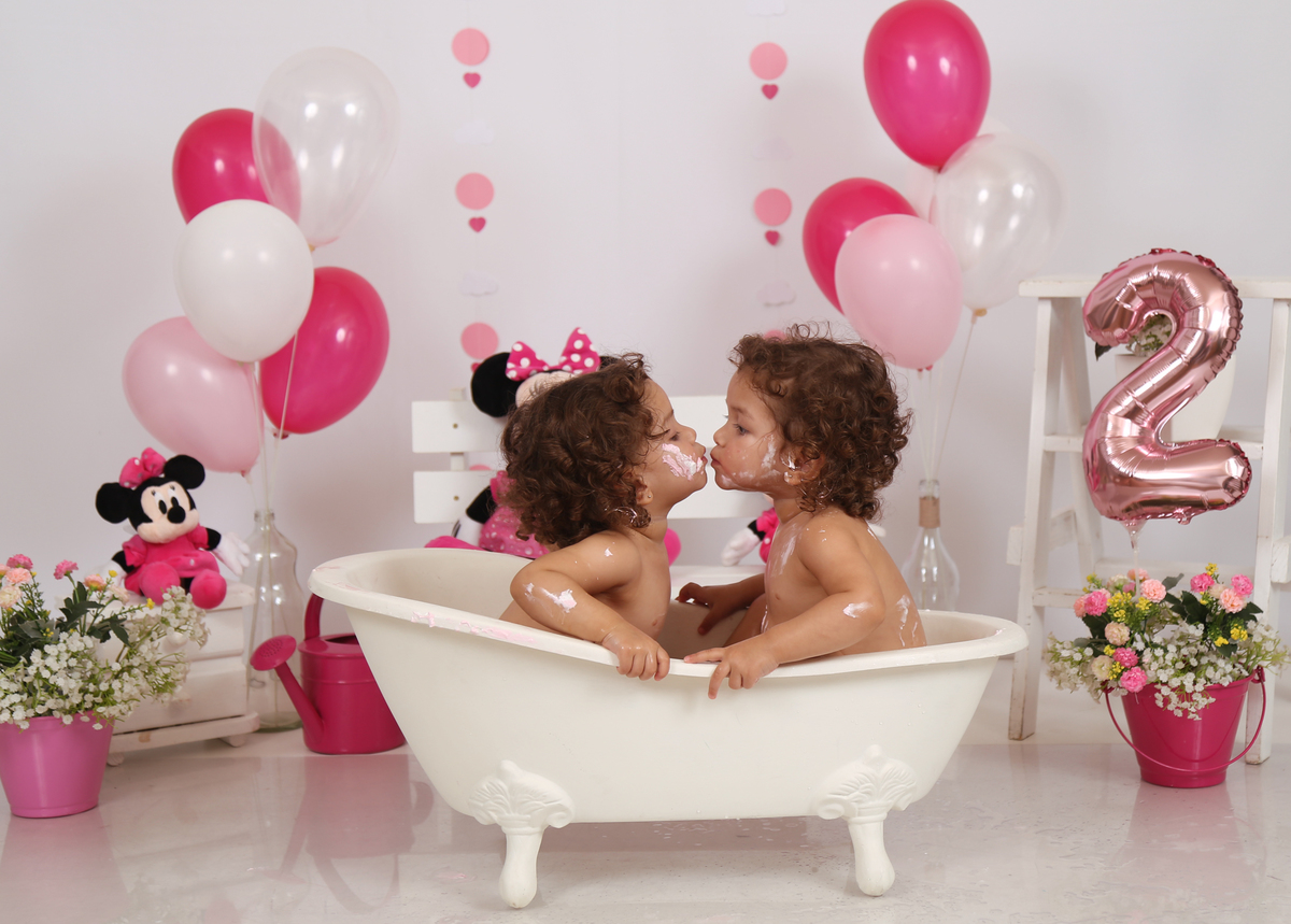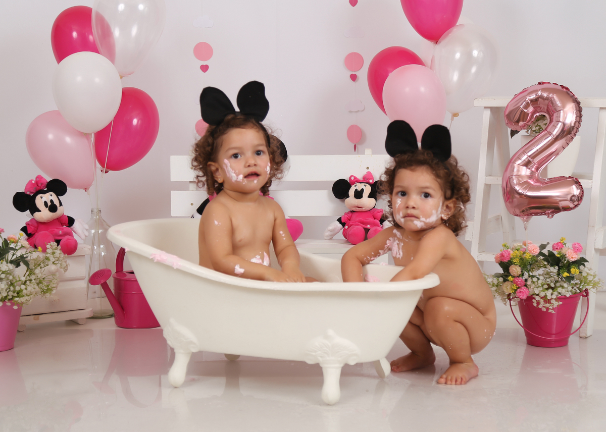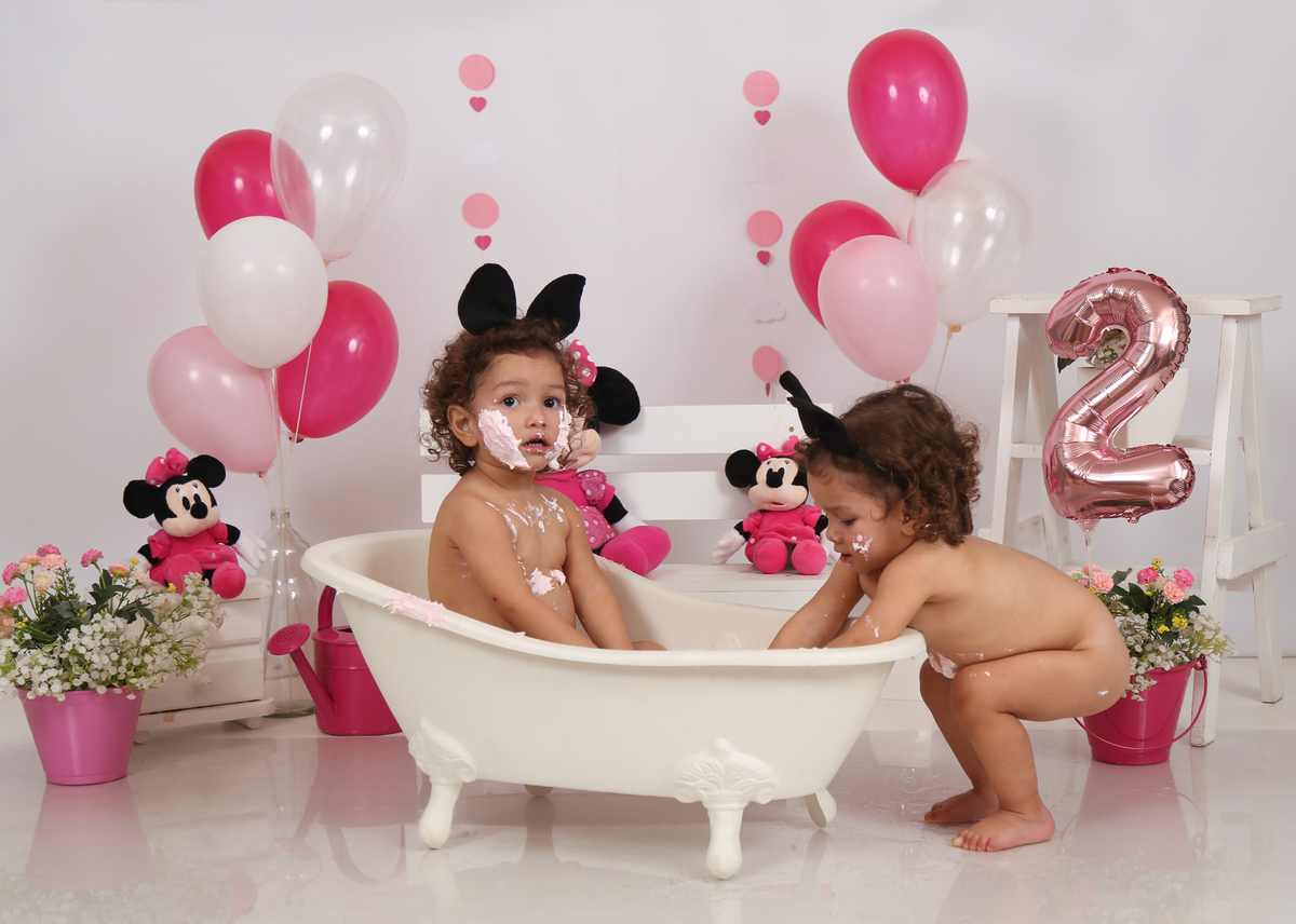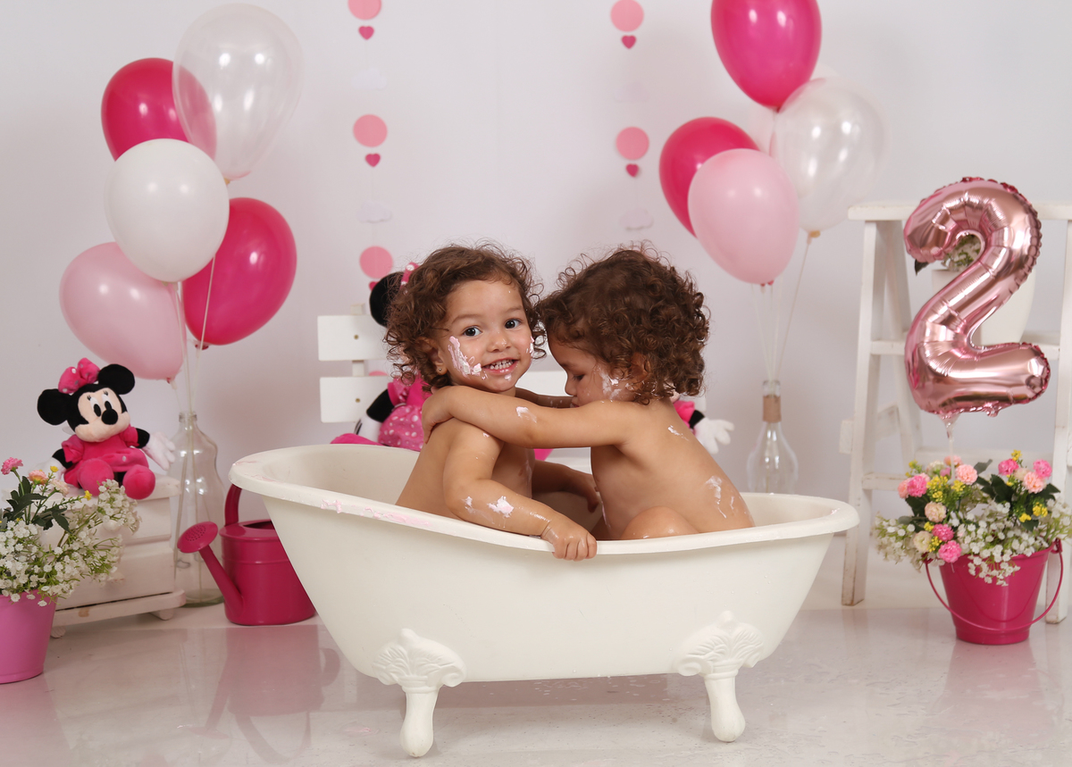 O lindo ensaio Smash The Cake das manas Ana Helena e Ana Victoria que fizeram muito lambuzo e muita festa na banheira!!!
